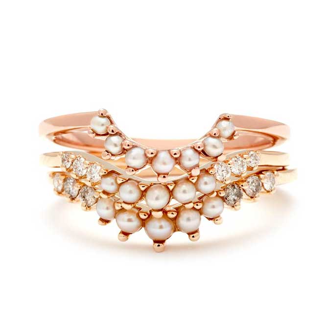 Nesting Suite No. 7 set of three bands detailed with seed pearls, white diamonds, and gray diamonds, in 14k rose and 14k yellow gold, $3, 550; Anna Sheffield