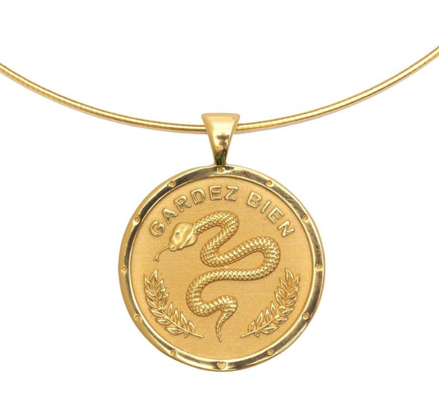 The chic, oversize coin pendants, which come in 10k gold, 14k gold-plated, and sterling silver (prices from just under $300 to around $700), are meant to symbolize “positivity, strength, hope, and luck,” she says.