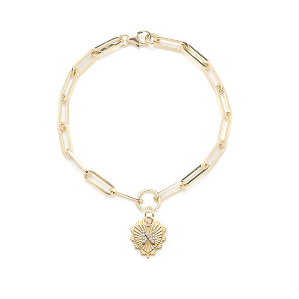 Top: Miniature Heart Initial Classic FOB Clip Chain bracelet in 18k gold with diamonds, $2,690; Foundrae
