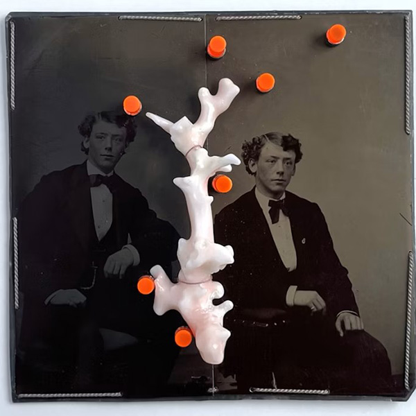 Top: Untitled brooch by Bettina Speckner, 2023, with antique tintypes, coral, silver, acrylic, and thread (photos courtesy of 92NY)