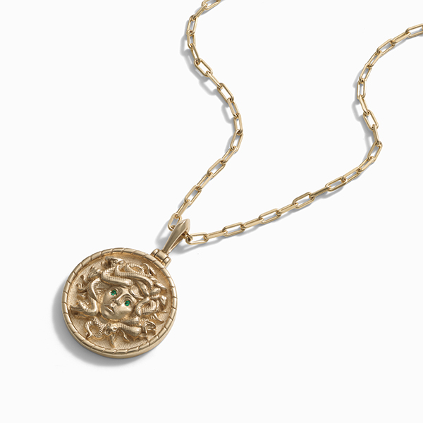 Top: The 14k gold Medusa necklace with emerald eyes and paper-clip chain, $2,600–$2,700, from Awe Inspired’s new Eternal Awe collection (photos courtesy of Awe Inspired)