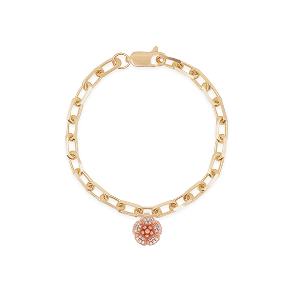The Pavé Flora capsule features rings, stud earrings, and single charm bracelets that previously were available only in white gold and white diamonds. James turns up the color through his choice of metal, like the petunia’s use of rose gold.