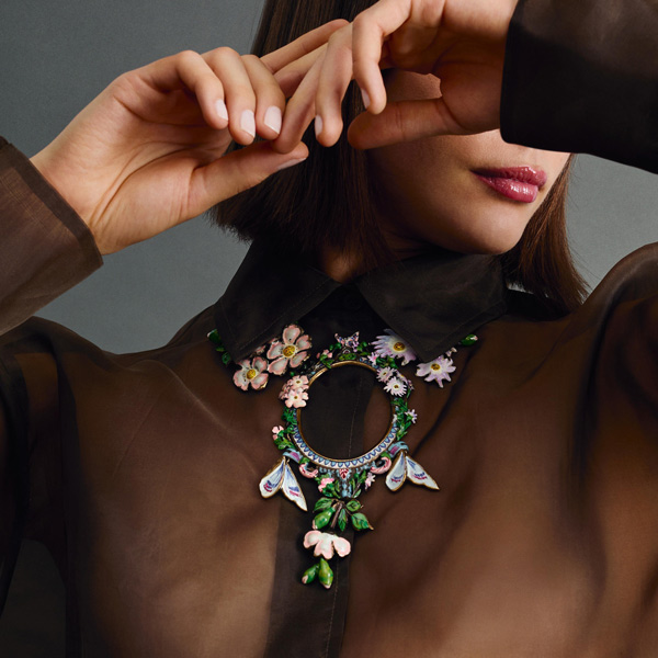 Top: John Galliano for Christian Dior necklace with flowers in enameled metal, from fall/winter 2001 ready-to-wear collection, estimate $2,200–$2,800