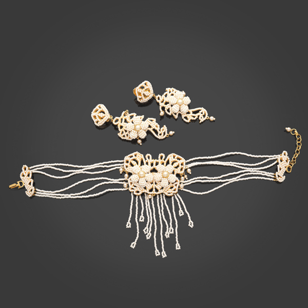 From Christian Dior, the Bonhams auction features jewelry designed by John Galliano during his tenure at the maison that exemplify Galliano’s theatrical romanticism, including an enameled metal flower necklace (pictured at top) and a fringed choker and matching earrings with pearl beadwork.
