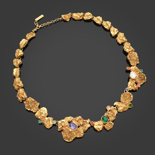 Yves Saint Laurent collectors will appreciate two rare pieces (pictured below) designed by Robert Goossens, both showing his mastery of transforming humble materials into dramatic statements: a gold-plated multicolor rhinestone necklace and a coral-effect necklace in blue lacquered metal.