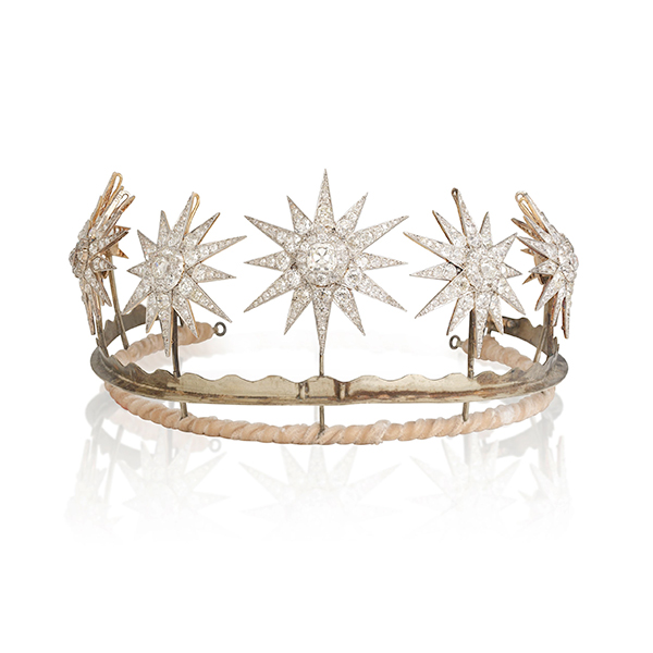 Lady Glenconner’s antique diamond star tiara, circa 1880, (pictured at top) realized £127,400 (approximately $169,000)—more than double its presale high estimate. This versatile jewel, featuring eight diamond stars totaling 78.5 cts. t.w., was famously worn by Lady Glenconner during her service as a maid of honor at the coronation of Queen Elizabeth II and while accompanying Princess Margaret on royal tours. The entire Glenconner collection achieved a “white glove” result, being 100% sold for a total of £256,065 ($340,000).