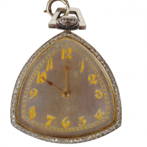 The auction house is also selling a pocket watch that belonged to famed gangster Al Capone, who was known as a snappy dresser. The triangular pocket watch, produced by the Illinois Watch Company, includes his initials, “AC,” spelled out in 23 diamonds, and has a platinum face and gold-tone numerals and watch hands.