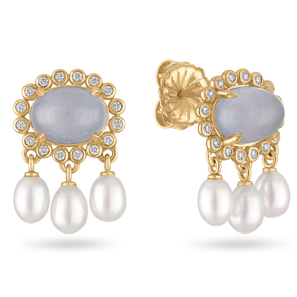 “I’m very drawn to cabochons in general—I love how the color diffuses and feels softer on the eye. The icy blue-gray chalcedony feels visually light, but the size is large enough to really take up space on the ear and make a statement. Your eye moves from the cool blue-gray stone to the white pearls and bright diamonds, while the yellow gold grounds everything in warmth.”