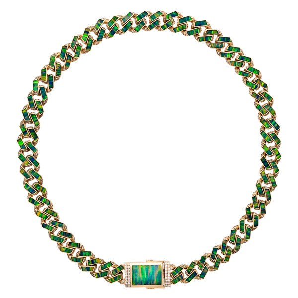 Top: Inlay curb chain bracelet in 14k yellow gold with opal and pavé diamonds, price on request; Jacquie Aiche