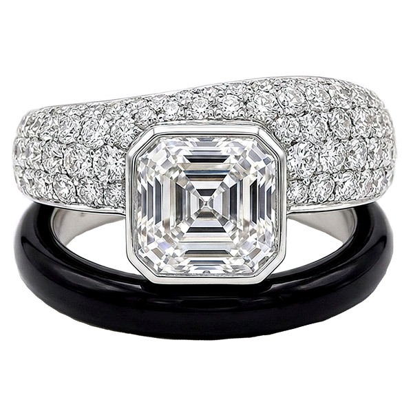 Top: Savoy ring in 18k white gold with 3.5 ct. Asscher-cut sapphire, 2.5 cts. t.w. pavé diamonds, and onyx, $22,000; LÖF Jewellery