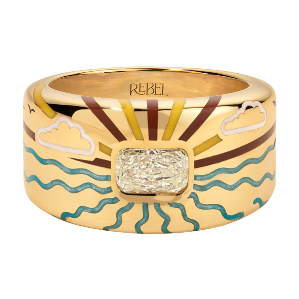 The particular piece shown here, with its depiction of the wide ocean, the sun’s rays glittering upon it, is imbued with meaning. “The Sovereign Voyage ring is inspired by our search for purpose while embracing the unknown and searching for answers,” says Rebel founder and designer Marie Helena. “The design and color selection is somewhat inspired by the ’70s era, reflecting sunrays, rolling waves, and a hidden message to the wearer: a sailboat for the adventurous and the rebellious.
