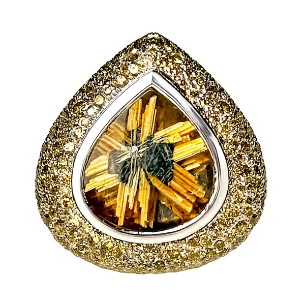 “The golden rutile inclusions naturally form a starburst, which inspired me to frame it in platinum and surround it with a full gradient of natural yellow diamonds—from soft champagne to vivid gold—evoking solar energy and divine protection,” the designer explains.