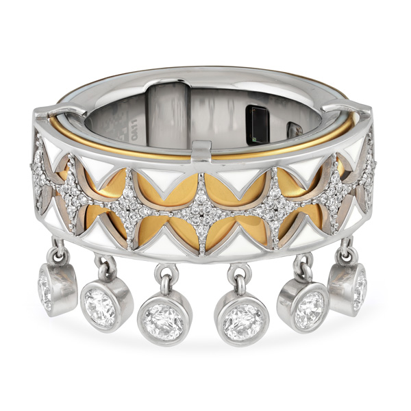 Just as Kalan’s tech ring jackets use her signature Fireworks setting, Toi’s version bears the marks of its maker’s design DNA: enamel and satiny white gold, bezel-set round diamonds dangling like charm confetti. The four-pointed star that’s a hallmark of Toi jewelry creates a negative space pattern for the smart ring to peek through, so the look can differ depending on the ring.