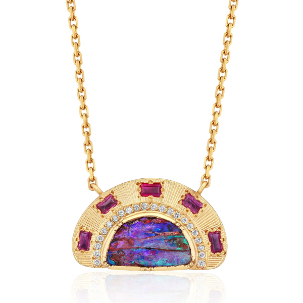 Top: Sun Ray necklace in 18k yellow gold with 1.7 ct. opal, 0.54 ct. t.w. rubies, and 0.33 ct. t.w. diamonds, $9,725; Brooke Gregson
