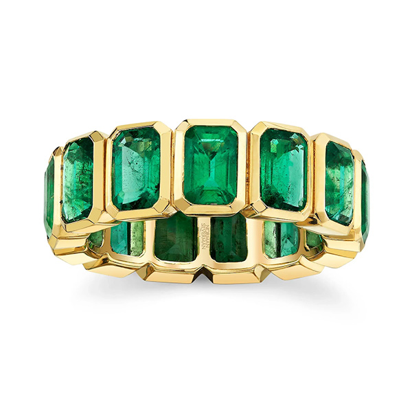 We have this one eternity band. It’s emerald-cut emeralds bezel-set in yellow gold. I don’t even know how many times we’ve sold it. Out of the big three gems, sapphires and emeralds are our best sellers, and ruby’s number three. But before Vegas, we always send out a questionnaire of what everyone wants us to get, and a few people on our sales team mentioned that they are getting requests for ruby set in yellow gold.