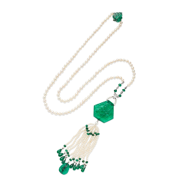 The sautoir, which also features diamonds, was originally commissioned in 1925—the same year F. Scott Fitzgerald’s novel The Great Gatsby was published—by one of Cartier’s most important clients, who already owned the 86.71 ct. emerald pendant carved with the Hindu deities Shiva and Parvati.