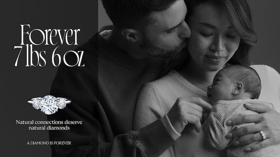 Besides “A diamond is forever,” the ad contains a new tagline, “Natural connections deserve natural diamonds.”