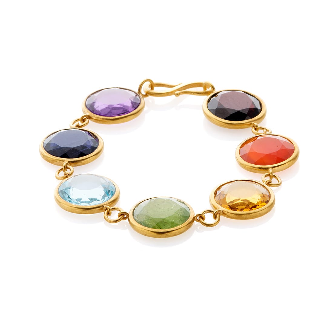 Buddha cameo pendant in 18k yellow gold with peridot, amethyst, sapphire, glass-filled ruby, and Venetian glass, $1,950; Bahina Jewels
