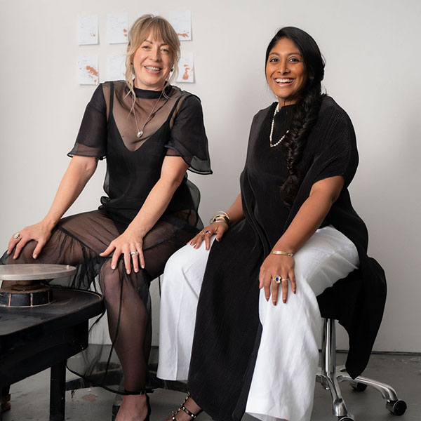 Top: Erin Hupp (left) brought her ceramicist’s eye to a jewelry collaboration with Goldstories’ Subikksha Balaje. (Photos by Hannah Franco/courtesy of Goldstories)