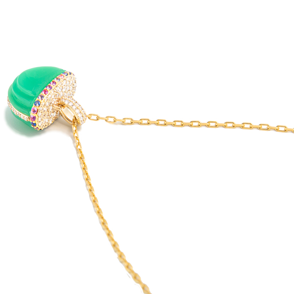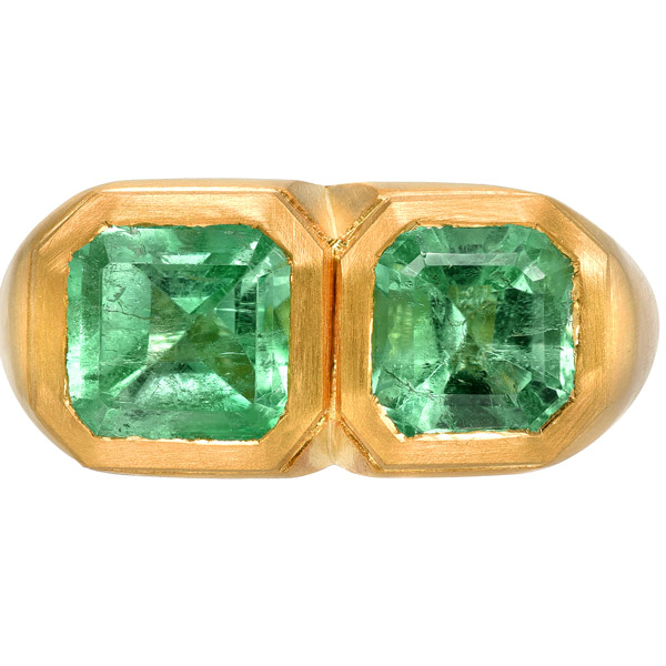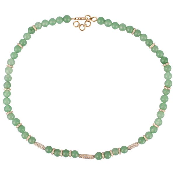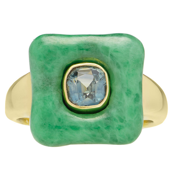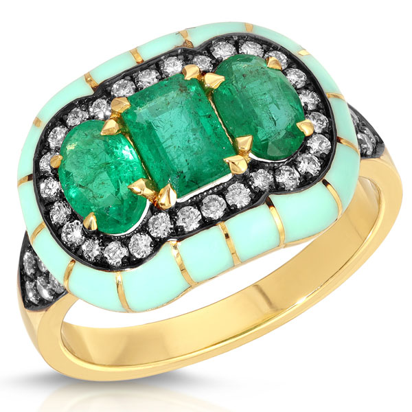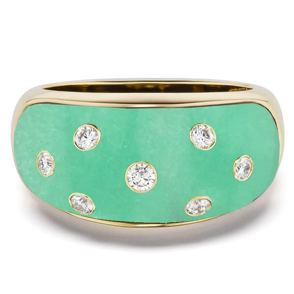 BomBae ring in 18k yellow gold with chrysoprase and 0.22 ct. t.w. diamonds, $3,700; Gemella JewelsChakra collar in 18k yellow gold with 88.87 cts. t.w. mint jade, 1.1 cts. t.w. blue topaz, and 2.62 cts. t.w. diamonds, $11,400; AnanyaDouble Mint ring in 18k yellow gold with 4.52 cts. t.w. emeralds, $17,650; Darius