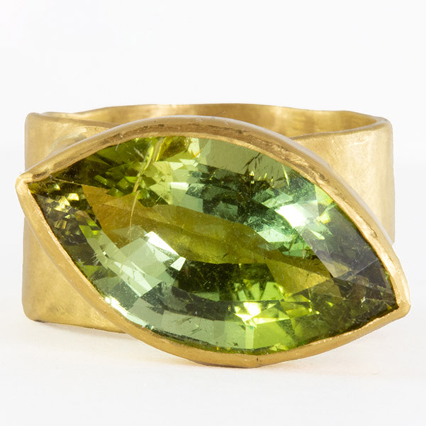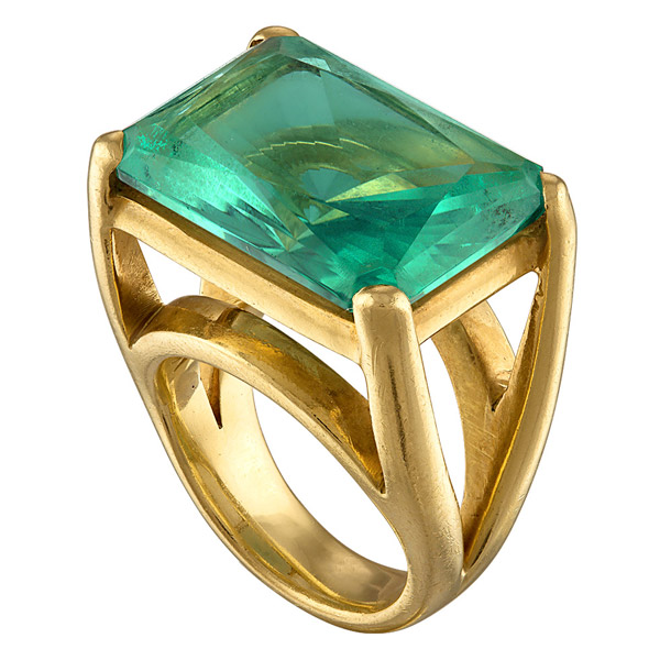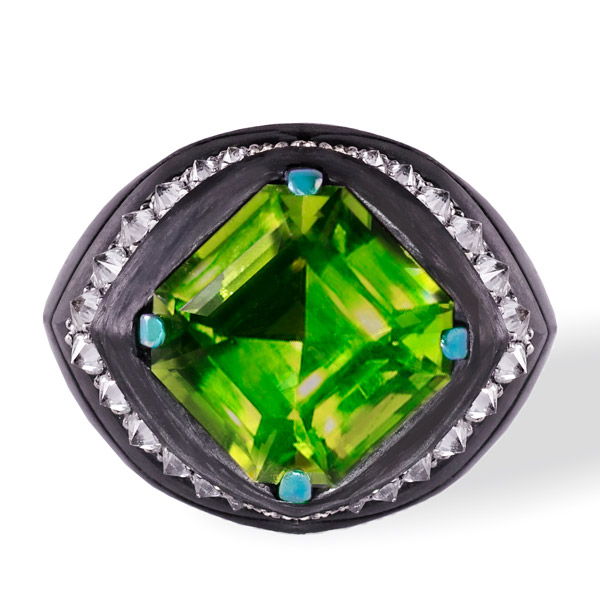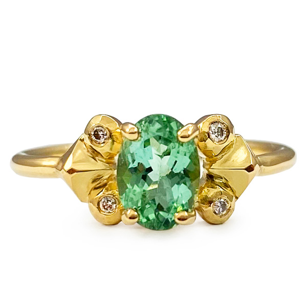 Architectural ring in 18k yellow gold with green topaz, $6,500; Dale NovickThe Edge Ferris Wheel pendant in 14k yellow gold with chrysoprase, sapphires, and diamonds, $7,680; Campbell + CharlotteMaestro ring in 14k yellow gold with 2.03 ct. green hexagon-cut sapphire, 0.23 ct. t.w. trillion rose-cut diamonds, and 0.06 ct. t.w. round brilliant diamonds, $4,400; Emily Gill (available at Gem Breakfast)Tsarina Mint Flake necklace in 18k black gold with 5.27 ct. green amethyst, 38.47 ct. chrysoprase, 0.25 ct. t.w. tsavorites, and 0.51 ct. t.w. diamonds, $10,890; Nadine AysoyLuz ring in 18k yellow gold with mint green tourmaline and diamonds, $2,310; Margaux Clavel
