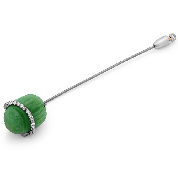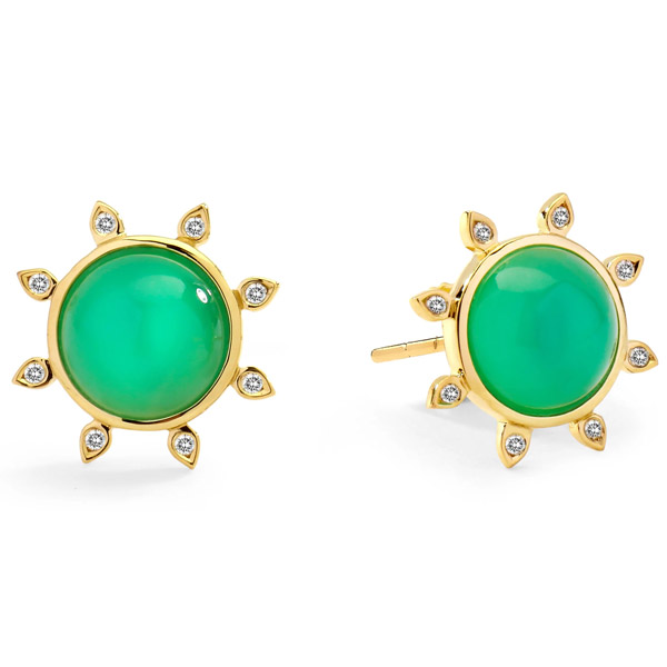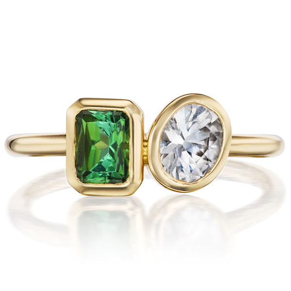 Sierra toi et moi ring in 14k yellow gold with 0.71 ct. white sapphire and 0.65 ct. green tourmaline, $1,875; G. St by Greenwich St. JewelersRock Candy ring in 18k yellow gold and enamel with 1.44 cts. t.w. emeralds and 0.4 ct. t.w. diamonds, price on request; Lord JewelryScarab lapel pin 18k white gold with 14.54 ct. chrysoprase and 0.29 ct. t.w. diamonds, $2,975; Kimberly McDonaldRing in 18k yellow gold with sphene, price on request; Uniform ObjectCosmic Sun stud earrings in 18k yellow gold with 4 cts. t.w. chrysoprase and 0.1 ct. t.w. champagne diamonds, $1,650; SynaBeacon ring in 18k yellow gold with green tourmaline, $3,200; Nikki Lorenz Designs
