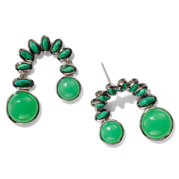 Top: Chime earrings in sterling silver and black rhodium finish with chrysoprase and malachite, $1,075; Nakard