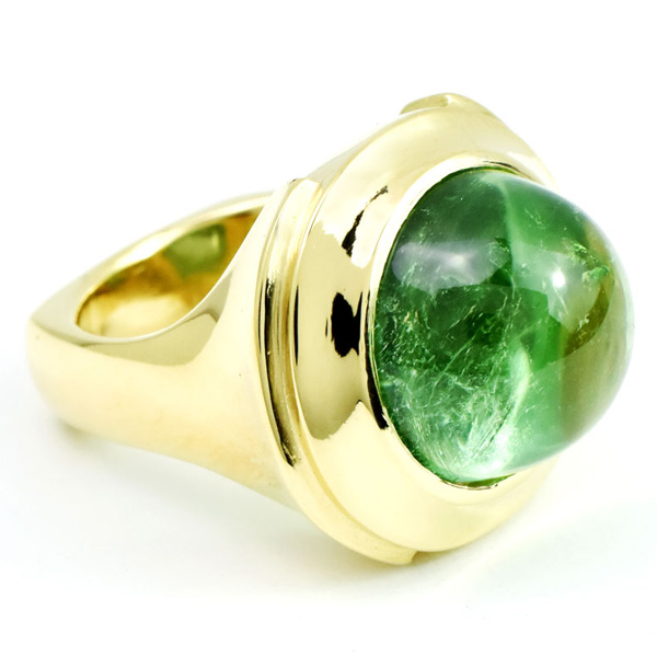 So what does that look like in jewelry? The aforementioned chrysoprase is a spot-on example, as good as it gets, really. But also jade, the right tourmaline, and even a peridot, though on the brighter side, make for a great match.