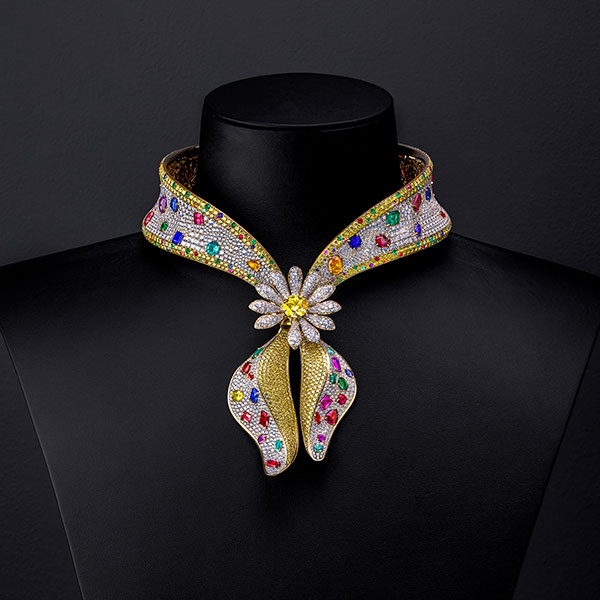 In total, 209.71 cts. of gemstones are set in 18k yellow gold on the Bandana Royale. Here’s the breakdown: 94.34 cts. white diamonds, 44.76 cts. canary yellow diamonds, and 54.6 cts. t.w. of emeralds, rubies, sapphires (orange, pink, blue, purple, and yellow), tsavorites, red and pink spinels, and paraiba tourmalines. Plus, there are 10.6 cts. t.w. of those stones in melee. Whew!