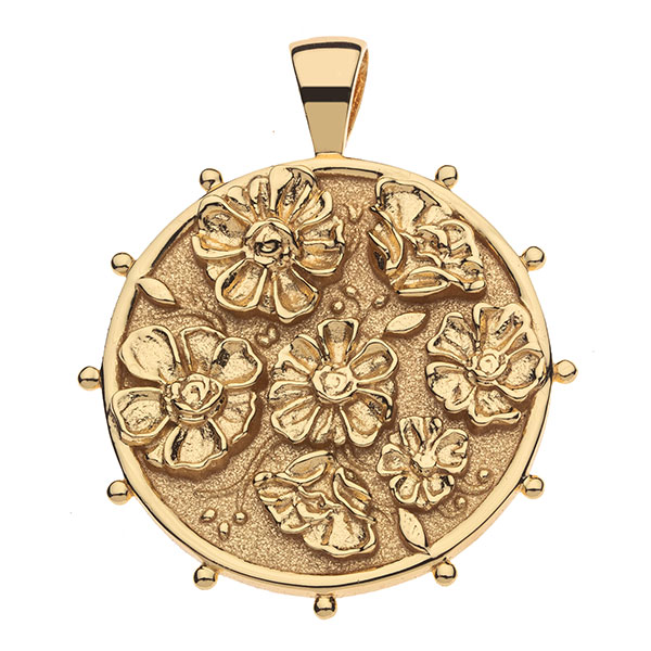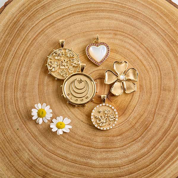 The Jane Win x Barbara Bush Foundation for Family Literacy collaboration, known as Bloom, features a peony, a heart, and two flower-embellished coins. Jane Win founder Jane Winchester Paradis says she focused on the peony for this collection because it was Barbara Bush’s favorite flower.