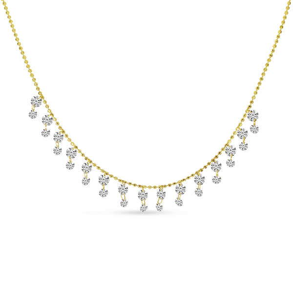 Top: Dashing Diamonds necklace in 14k yellow gold with 1.95 cts. t.w. natural pierced diamonds, $4,945; Brevani/Color Merchants
