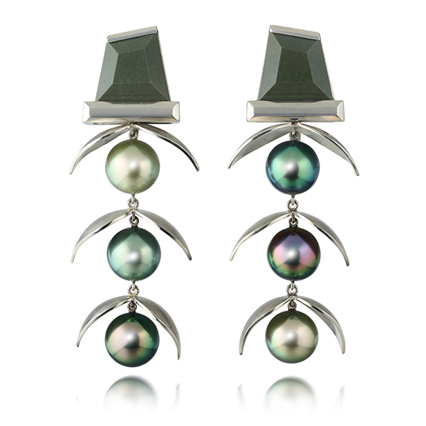 Top: Skin Deep Pot earrings with Tahitian pearls and green jasper in platinum, price on request; Cora Sheibani