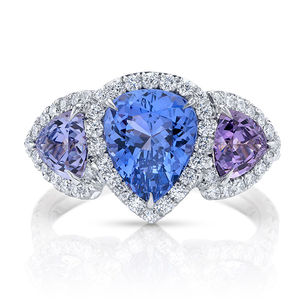 Top: Platinum ring with 2.33 ct. pear-shape purple spinel, 1.5 cts. t.w. trillion-cut lavender spinels, and 0.88 ct. t.w. round diamonds, price on request; Omi Privé