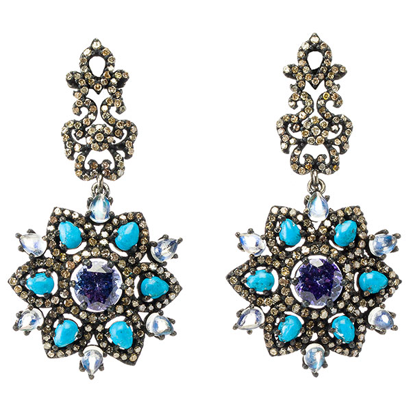Top: Harini earrings with 5.94 cts. t.w. turquoise, tanzanite, and moonstones and 1.95 cts. t.w. diamonds in rhodium-plated sterling silver, $2,000; Modern Moghul