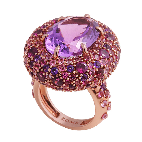 Top: Celestia Nebulite ring with amethyst center, pink sapphires, pink tourmalines, and amethyst in 18k rose gold, AED 37,100 ($10,102); Zome