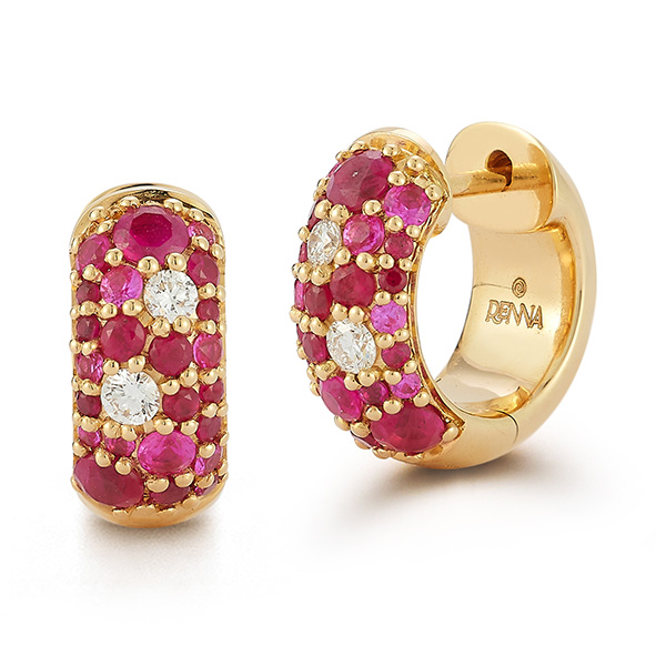 Top: Tidepool Huggie hoops with rubies, pink sapphires, and diamonds in 18k yellow gold, $4,000; Renna