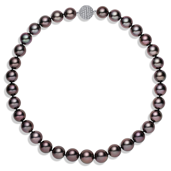 Top: 18-inch necklace with 12 mm x 14 mm Tahitian South Sea pearls and 1.8 cts. t.w. diamond 18k white gold clasp, $102,000; Baggins
