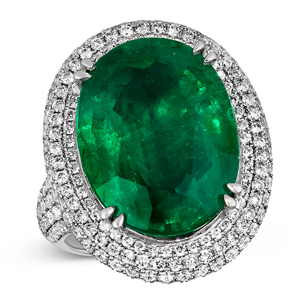 Top: Ring with 15 ct. Costa Smeralda Emerald and 4.3 cts. t.w. Vanilla Diamonds in 18k Vanilla Gold, $296,798; Le Vian