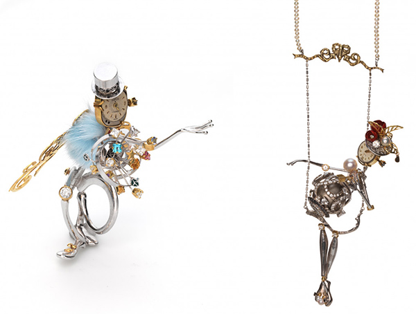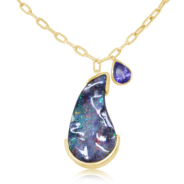 Top: Necklace in 14k yellow gold with Australian boulder opal and tanzanite, $6,745; Parlé