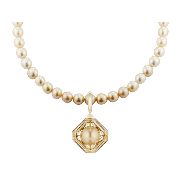 18k yellow gold Guardian Gold Temple pendant ($38,000) with a central golden South Sea Pearl framed with diamond patterns, and a strand of golden ombré 9–11 mm South Sea pearls with 18k clasp with Akoya pearls and diamond pavé. The back has shibori-inspired cut-out designs in platinum and is framed with a cherry blossom motif.
