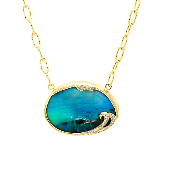14k yellow gold necklace ($4,980) on a paper-clip Italian chain with a 78.67 ct. boulder opal with green-blue and black hues and 42 round natural pavé diamonds