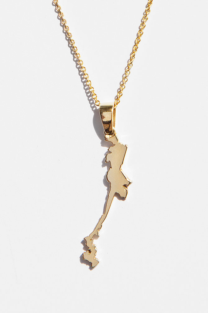 Launched last week in collaboration with political consultant Arielle Yuspeh and jewelry designer Romy Devack, founder of Sincerely Jewelry and a former celebrity stylist, the collection includes six documented gerrymandered Congressional districts—TX-35, MI-14, FL-4, LA-6, OH-1, and NC-6—reimagined as necklaces and pins in 14k yellow, white, and rose gold plated sterling silver.