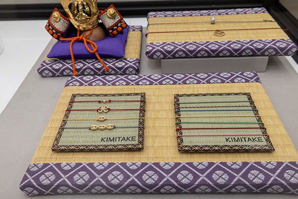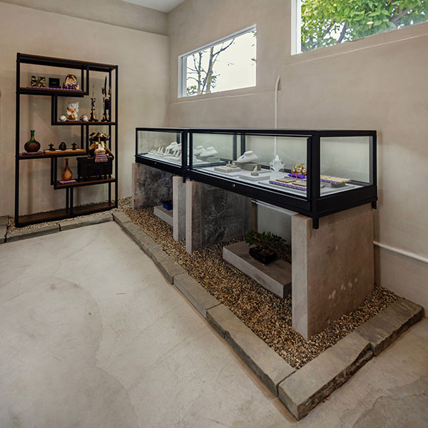 Seasonal flowers throughout the Kimitake store evoke nature’s presence, peace, and stillness, Fukutani explains. The blooms stand in single-flower vases that are Shigaraki ware, a traditional ceramic from the Mie prefecture dating back to the 13th century and considered one of the “Six Ancient Kilns” of Japan. (Mie is also where the samurai braided cord used in a Kimitake line of jewelry pieces is produced.)