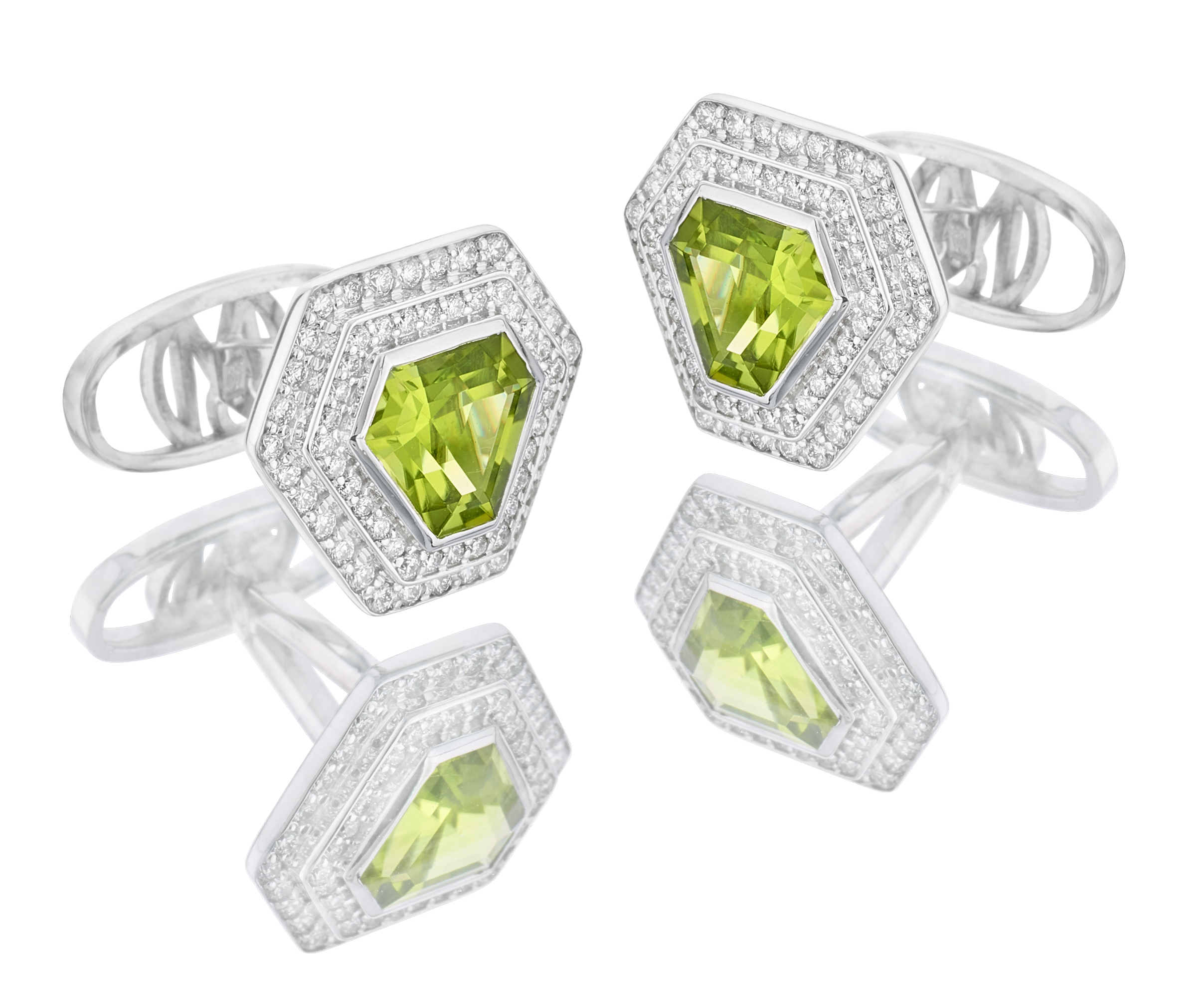 Chameleons cufflinks in 18k white gold with peridot and diamonds, $7,000; Oh My Got