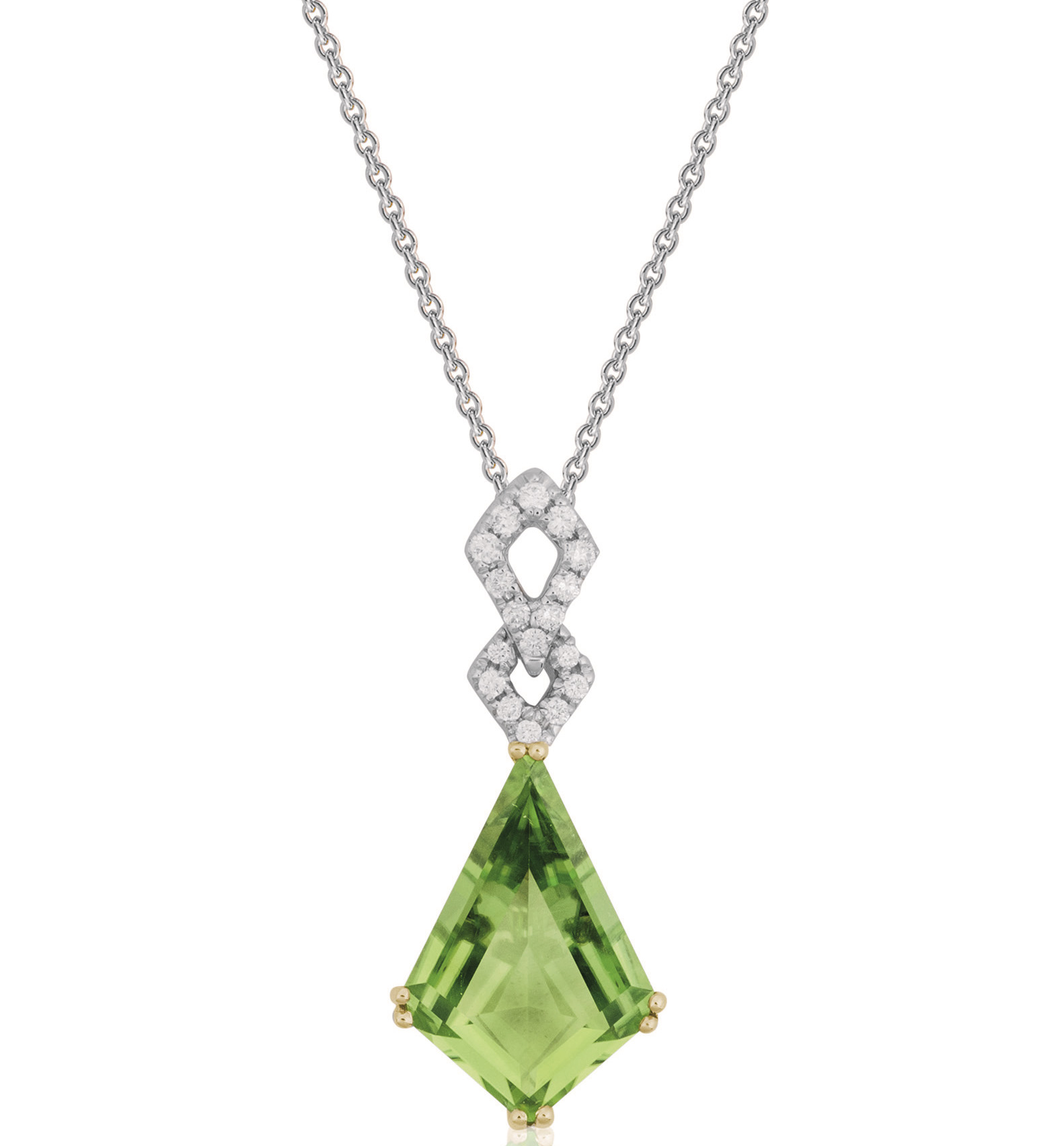 Kite-shape pendant in 14k white gold with 3.08 ct. peridot and 0.11 ct. t.w. diamonds, $1,854; Artistry, Ltd.