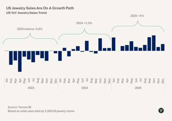 Year-over-year, jewelers’ sales jumped 5.6% in 2025 but rose only 3% in November and 5.4% in December, Tenoris said.