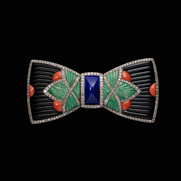 Top: Bow tie brooch by Lucien Hirtz (1864–1928) for Boucheron in platinum with onyx, coral, jade, lapis lazuli, and diamonds (6.03 by 12.06 cm), from the Collection of Neil Lane (Jewelry photographs © Lendon Flanagan)