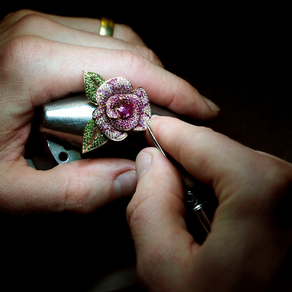 “Deep pink sapphires and rubies come together in variegated petals that hold a central diamond. This rose has detailed green leaves that delicately climb the knuckle of the wearer’s hand and gleam like stained glass when held to the light.”