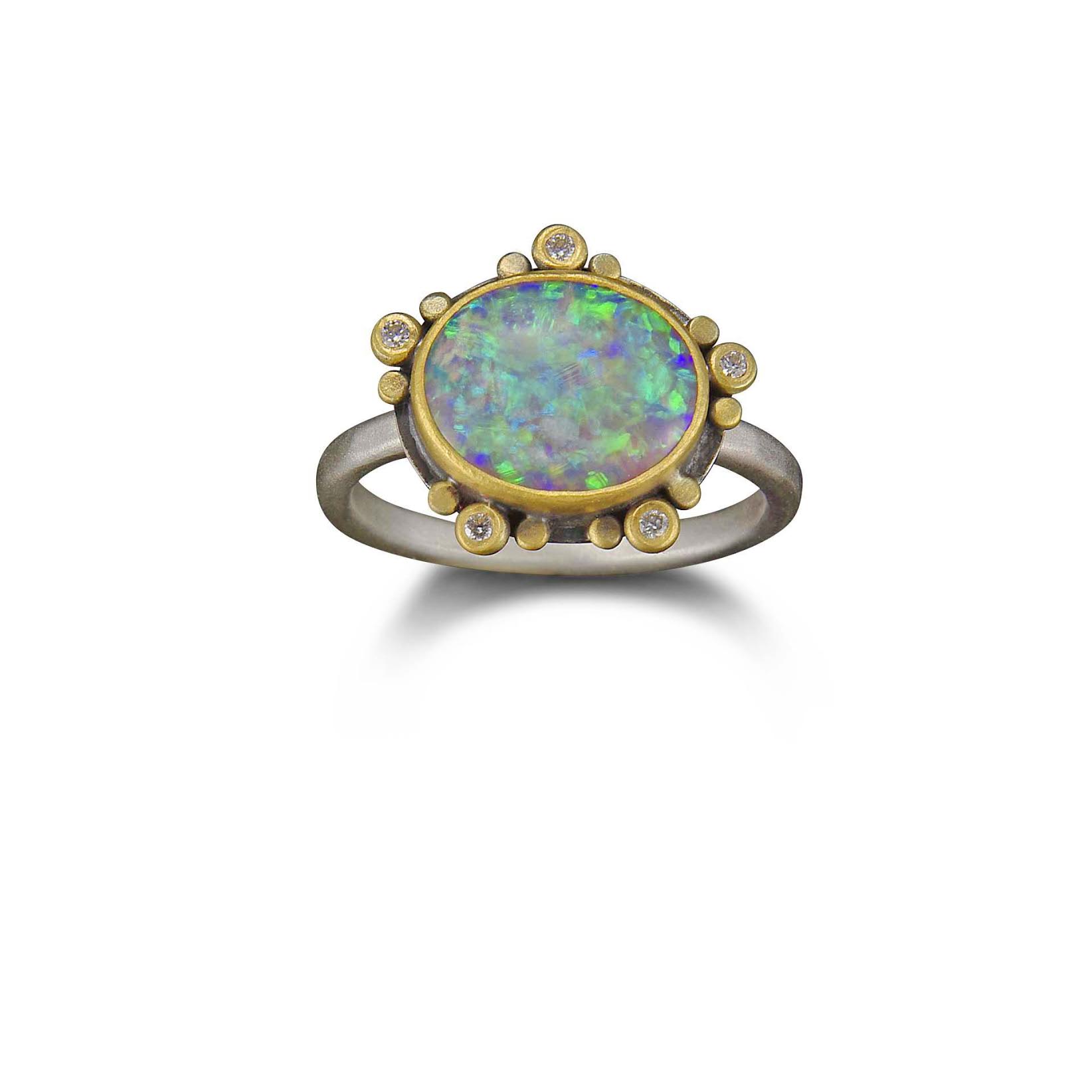 Ring with a semi-black opal, sterling silver band, and 22k gold bezel and dots, $2,250; Ananda Khalsa