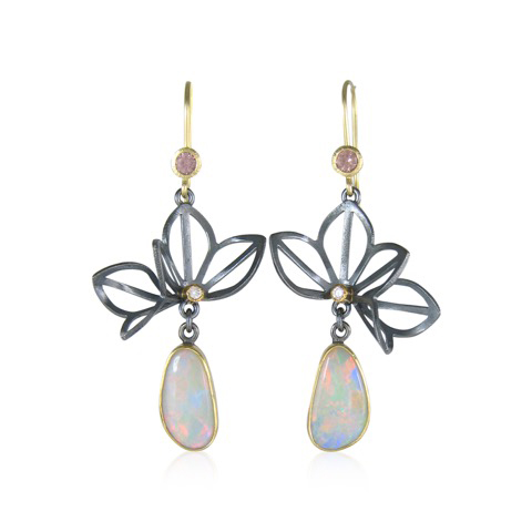 Folded Lotus Earrings with opals, Malaya garnets, and recycled diamonds in 22k gold and sterling silver, $1,750; Karin Jacobson